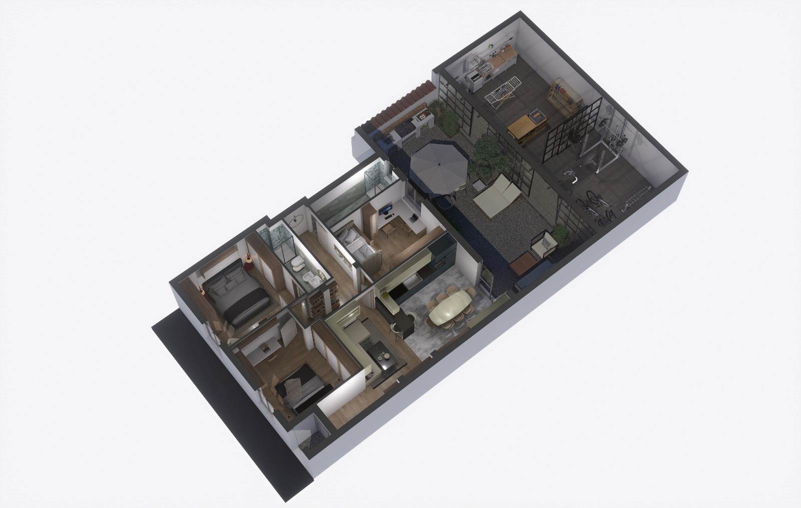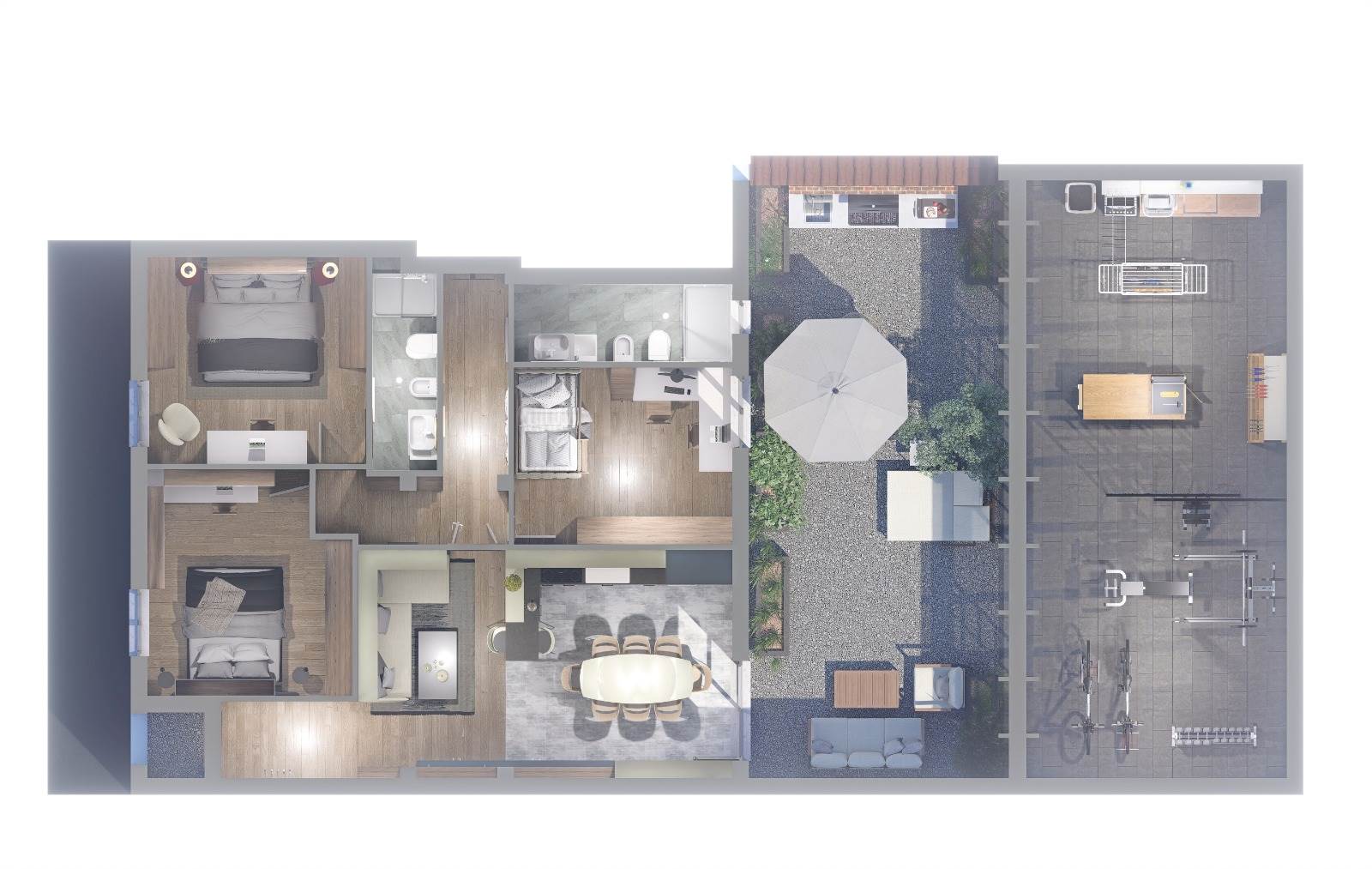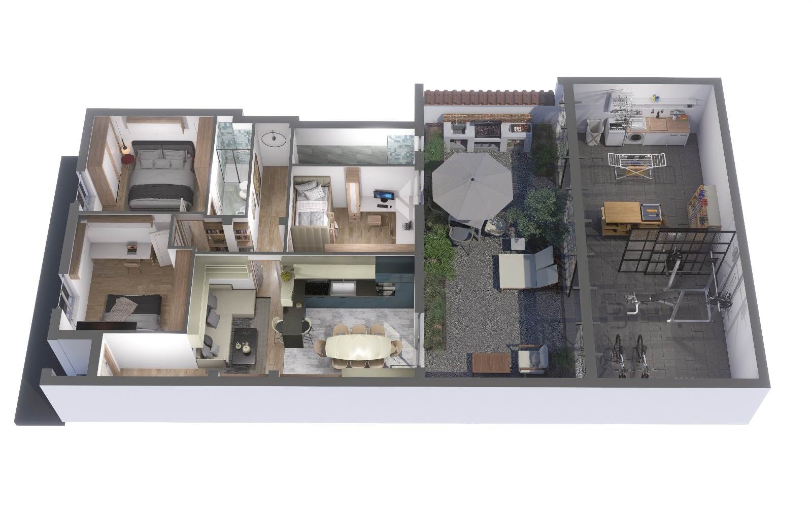 Appartamento al piano terra nuova ristrutturazione, composto da ingresso, zona giorno con cucina a vista, due camere matrimoniali di cui una con bagno interno, camera singola e bagno di servizio, oltre resede tergale con ampia zona lavanderia e zona relax coperta di circa 50mq adatta a palestra o zona living la veranda esterna e' circa 100mq chiusa da vetrata scorrevole.